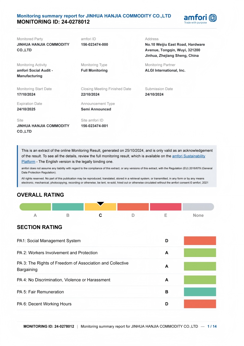 V júli 2025,Jinhua Hanjia Commodity Co., Ltd.Úspešne získal certifikáciu na úrovni C v Medzinárodnom programe Klasifikácie pre štandardy (ICS), ktorý vykonal Európska inšpekčná agentúra tretej strany vymenovaná spoločnosťou Cooperative Union Enseigne. Tento certifikačný systém pozostáva zo štyroch úrovní: A, B, C a D. Ako člen francúzskej obchodnej komory a priemyslu (FCD), spoločnosť dodržiava Medzinárodnú prácu v oblasti sociálnej organizácie Labour Management Standard SA8000, implementácia auditov sociálnej zodpovednosti v oblasti dodávateľov. Rozsah auditu sa týka kritických oblastí vrátane ľudských práv, ochrany zdravia a bezpečnosti, pakrzných podmienok, mlužých a dokumentácie.
