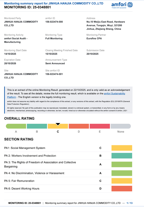 Jinhua Hanjia commodity Co., Ltd. zverejnila výsledky svojho auditu BSCI. Dňa 14. októbra spoločnosť úspešne prešla odborným hodnotením a získala certifikáciu triedy C, ktorá spĺňa minimálne požiadavky špecifikované zákazníkom. Doba platnosti tejto certifikácie je jeden rok. Audit BSCI vykonala agentúra vybraná zákazníkom. Tento zákazník nakupuje od našej spoločnosti výrobky z nehrdzavejúcej ocele a otvárače na víno dlhú dobu, ako sú otvárače vína, koktaily. krajina zákazníka vyžaduje, aby dodávatelia vlastnili tento certifikát.